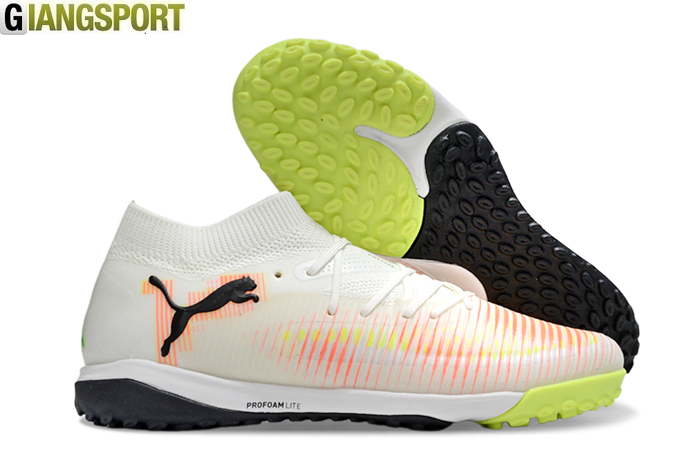 Điểm đặc trưng của dòng Puma Future 8 Ultimate TF là chất liệu da bê mềm, nhẹ, êm cùng với các đường vân nổi trên mu bàn chân, giúp tạo thêm lực xoáy khi tác động với trái banh. Phần đệm đế mềm êm và đàn hồi tốt.